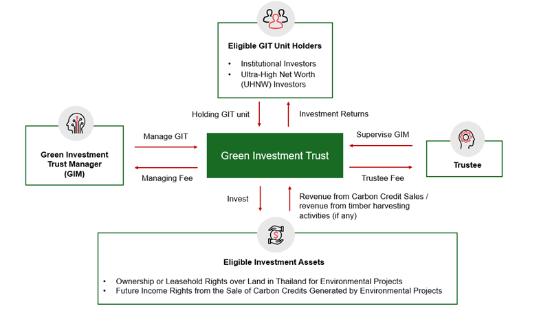 The proposed draft establishes GIT as a fundraising vehicle, with investments primarily focused on environmental projects aimed at reducing or sequestering greenhouse gas emissions through forestry and agricultural activities, registered under the Thailand Voluntary Emission Reduction Program (T‑VER) or other recognized standards. According to the Public Hearing, the GIT must earn its income from the sale of carbon credits and certain timber harvesting activities, in accordance with the requirements prescribed by Thailand Greenhouse Gas Management Organization (TGO). The Public Hearing will end on 9 February 2026.